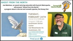 The Audubon Society of Mahoning Valley presents the program, "Ghost From the North" on Tuesday, February 24 at 6:30pm at the Austintown Senior Center at 112 Westchester Dr. Joe Malmisur, an award-winning naturalist from Summit Metroparks, will present a program about a diurnal and nomadic species, the Snowy Owl. The event is free and open to all.